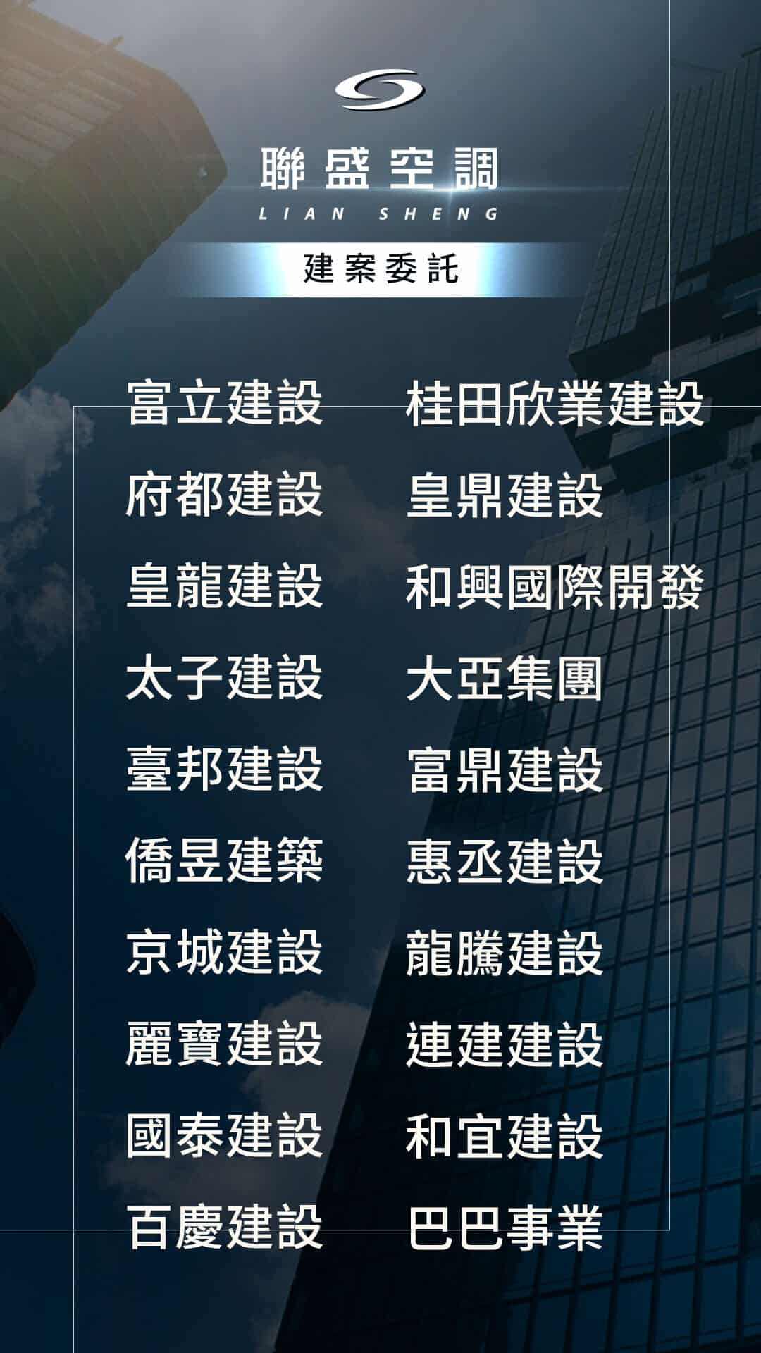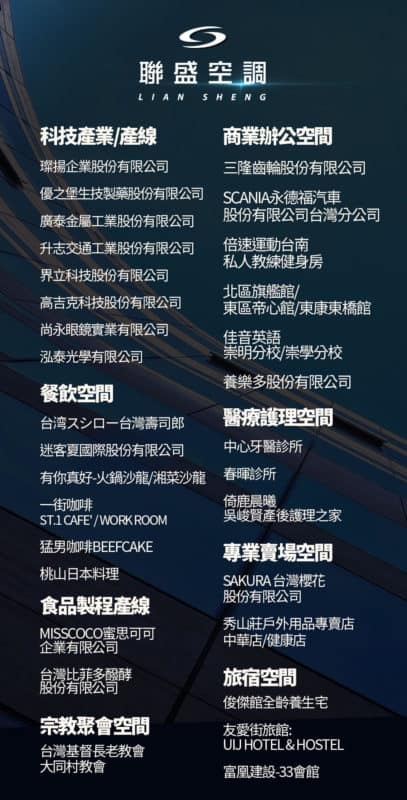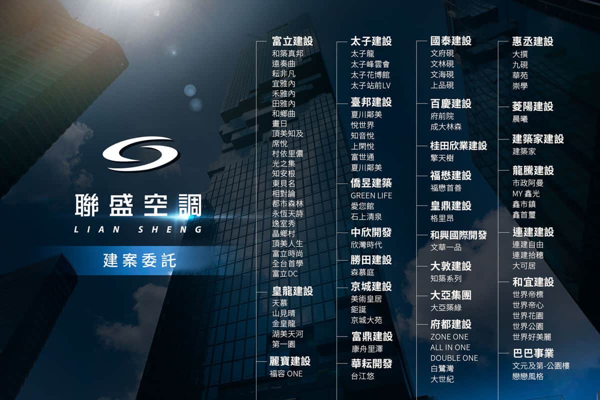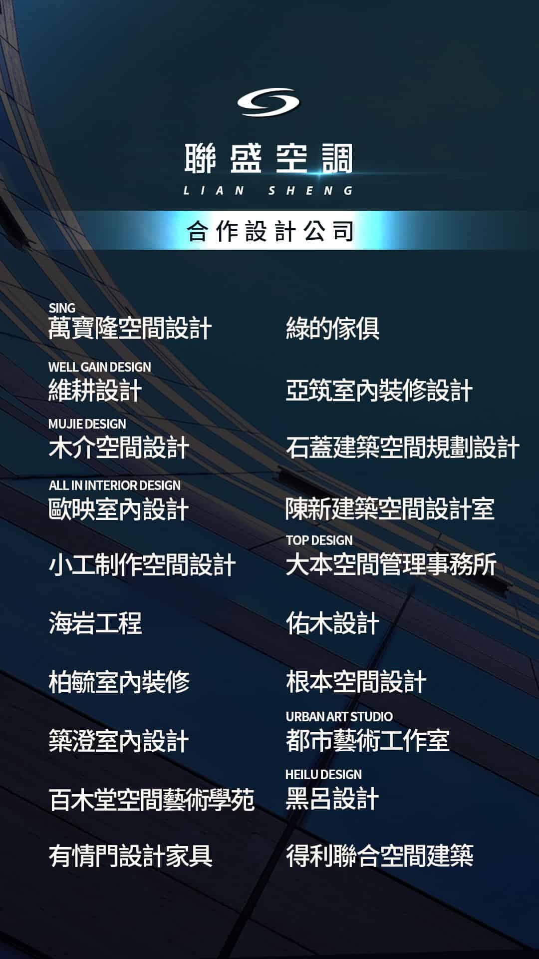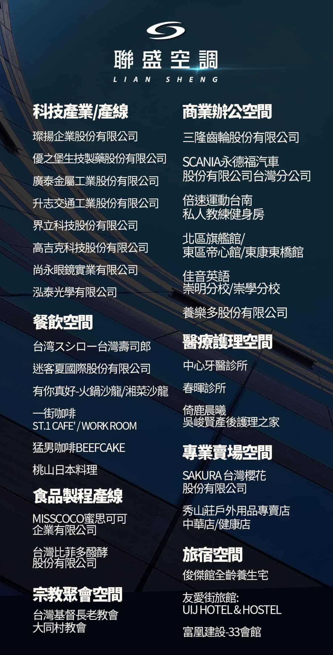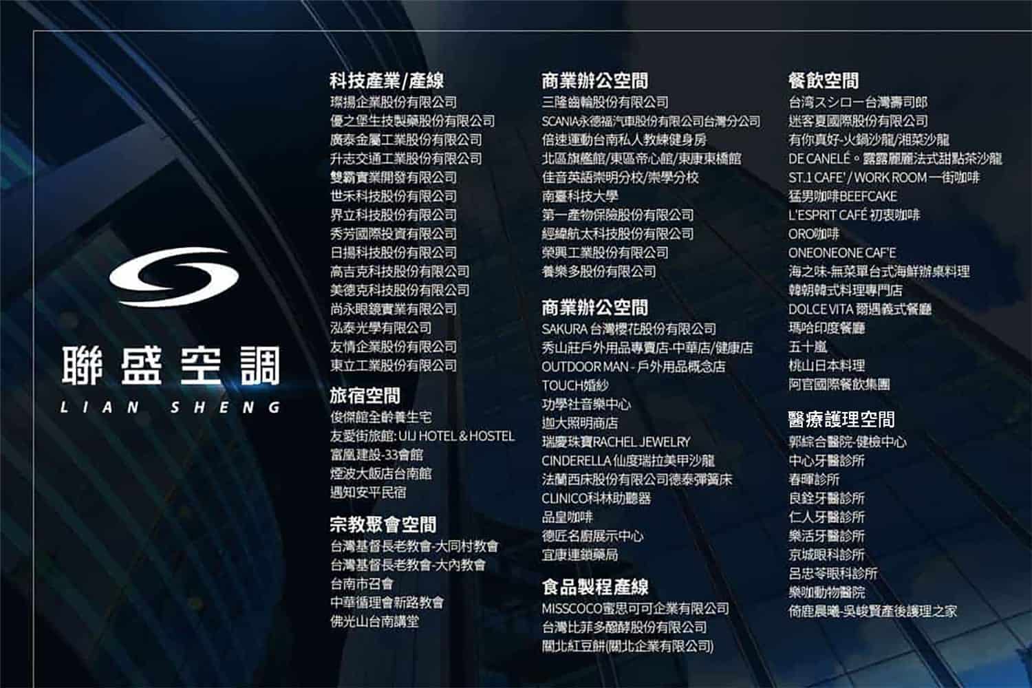 空調工程規劃設計/控制系統整合/智慧節能空調 聯盛冷氣空調有限公司 聯盛節能空調科技有限公司 優良的施工品質 追求實用與美學並進 注重使用上耐久性 完整的售後服務 服務項目 ◆變頻多聯式空調 VRV / VRF/ Set-Free ◆商用變頻空調 / 機房空調控制系統 ◆新風換氣系統 / 恆溫恆濕控制 ◆智慧節能空調 / 雲端系統整合 ◆全熱交換器/埋入型除濕機/埋入型空氣清淨機 ◆空調設備選機規劃 ◆空調設計模擬軟體熱負荷計算 ◆空調配置施工AutoCAD圖繪製 ◆電力負荷計算 ◆電力線圖繪製 ◆工程標單設計製作 關於聯盛 聯盛冷氣空調有限公司於民國88年創立,運用專業的空調設計知識與實務經驗,針對不同的空間用途與冷房需求,設計出合宜的空調系統;亦與許多業界知名設計公司合作,發展出許多奠基於工程美學與實用需求下的施工技法,並且特別注重使用上的耐久性、舒適性與美觀感受。更提供完善的售後維護與定期檢修服務,旗下的空調技師亦都具備高度的空調專業度與施工相關培訓。 秉持著誠信經營的理念,以永續的發展為目標 。 各類專業證書/證照 經濟部冷凍空調工程業登記證書 台灣區冷凍空調工程工業同業公會證書 各大品牌空調銷售績優獎 各大品牌傑出經銷商認證 乙/丙級冷凍空調裝修技術士證照 甲種職業安全衛生業務主管 VRV系統設計認證 工程實績 聯盛空調創立至今二十餘年, 不論是住家、廠辦、商業空間、集合式住宅、 餐廳飯店等的空調規劃與安裝, 均累積了十分豐富的實務經驗 聯盛空調創立至今二十餘年, 不論是住家、廠辦、商業空間、集合式住宅、 餐廳飯店等的空調規劃與安裝, 均累積了十分豐富的實務經驗 全熱交換器/埋入型除濕機/PM2.5淨化箱 室內空調配置 室外機施工工法 商業空間空調規劃 業主推薦 服務流程 服務流程 聯絡我們 地址 708台南市 安平區建平七街838號 營業時間 周一至周五9:00~18:00 062953738 ID : @737eolyt ls062953738@gmail.com